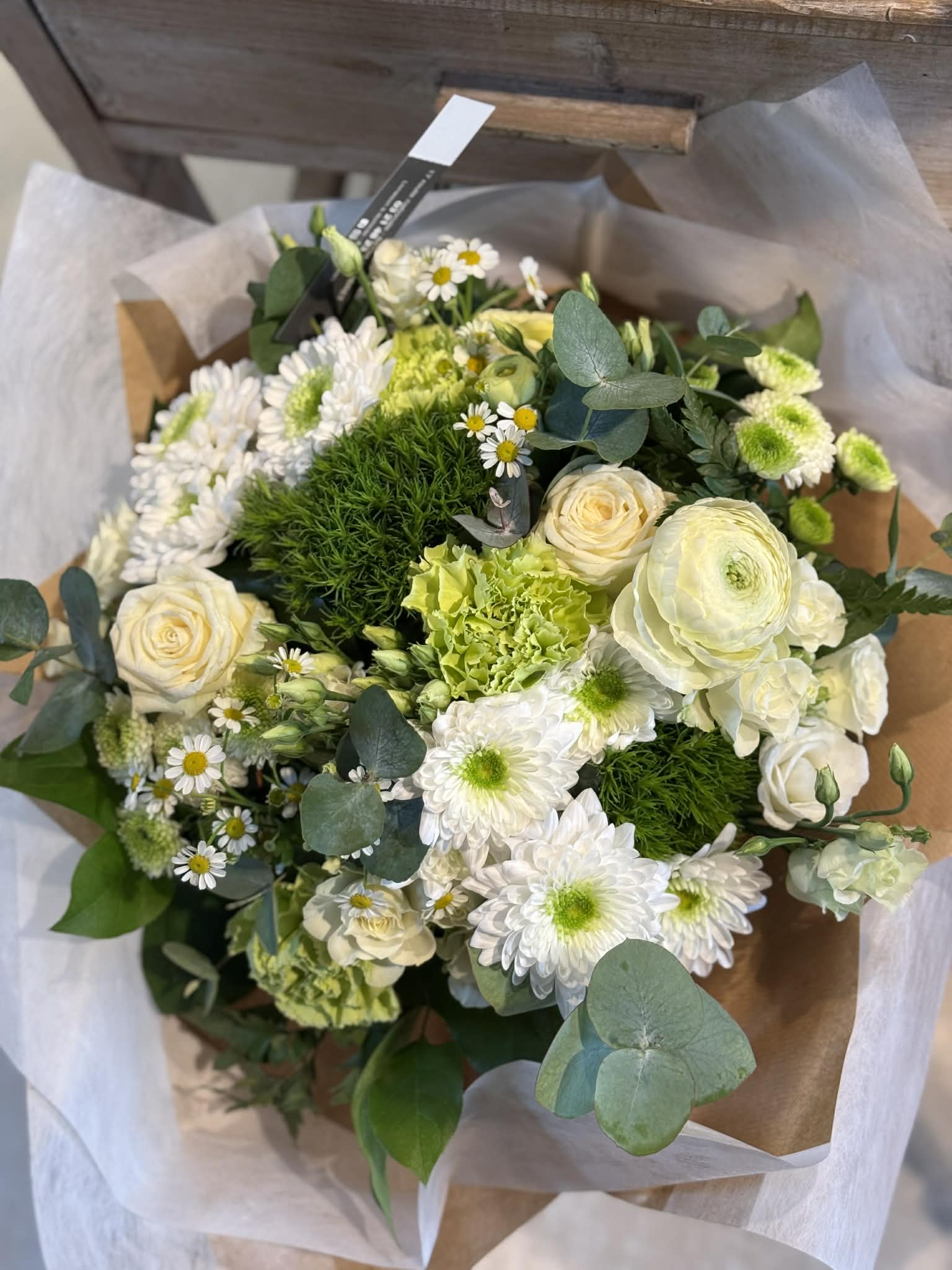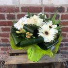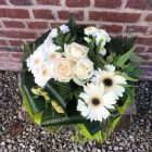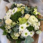 Ce magnifique bouquet de fleurs dans les tons blancs est composé de belles roses de couleur blanches et de petites fleurs de saison, sublimées par un feuillage fin et délicat (à adapter selon les couleurs).