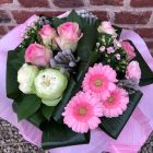 ‍Ce magnifique bouquet de fleurs dans les tons roses est composé de belles roses de couleur fuchsia et de petites fleurs de saison roses pâles, sublimées par un feuillage fin et délicat (à adapter selon les couleurs).