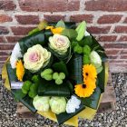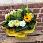 Ce magnifique bouquet de fleurs dans les tons jaunes, verts et blancs est composé de belles roses et de petites fleurs de saison , sublimées par un feuillage fin et délicat (à adapter selon les couleurs).